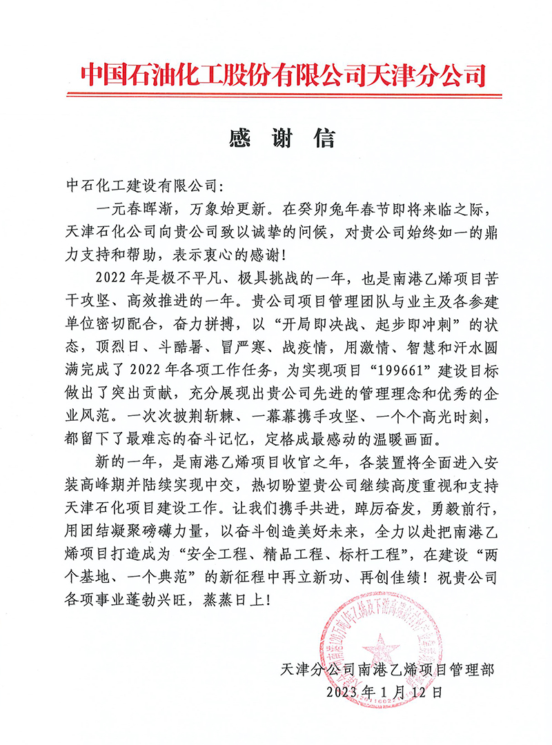 由公司承建的中國石化南港乙烯項目再次榮獲甲方贊譽