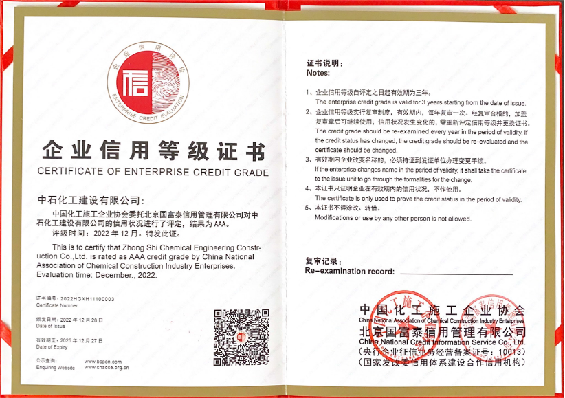 近日,由中國化工施工企業(yè)協(xié)會組織的2022年度化工工程建設行業(yè)企業(yè)信用等級評價結(jié)果揭曉,我司獲評 “AAA級信用企業(yè)”。